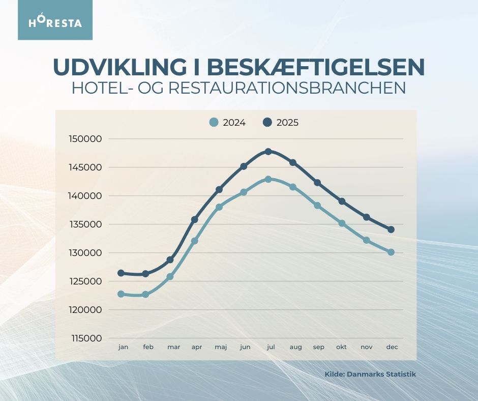 Ser man på hele året under ét, beskæftigede hotel- og restaurationsbranchen i gennemsnit 137.405 personer. Det er 3.888 flere end i 2024 og svarer til en fremgang på 2,9 pct. Sammenlignet med 2019, og dermed tiden før pandemien, er beskæftigelsen siden vokset med hele 15,7 pct. Det viser beskæftigelsestal for lønmodtagere fra Danmarks Statistik, som HORESTA har analyseret.