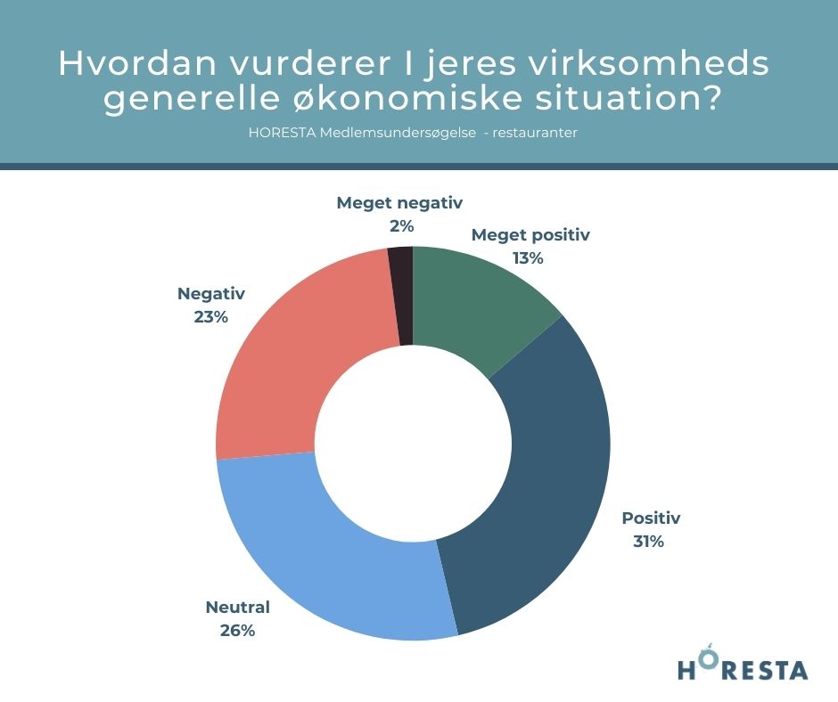 I HORESTAs seneste medlemsundersøgelse vurderer 44 pct. af restauranterne på landsplan deres generelle økonomiske situation som enten positiv eller meget positiv. 26 pct. betegner situationen som neutral, mens 25 pct. har en negativ vurdering af egen økonomiske situation.